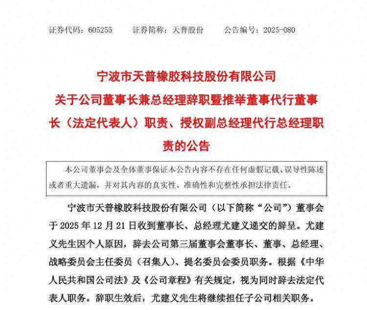 12月22日晚,宁波市天普橡胶科技股份有限公司(以下简称“天普股份”)公告称,尤建义因个人原因,辞去公司第三届董事会董事长、董事等职务,由公司董事沈伟益暂代行董事长(法定代表人)及战略委员会主任委员等职务。