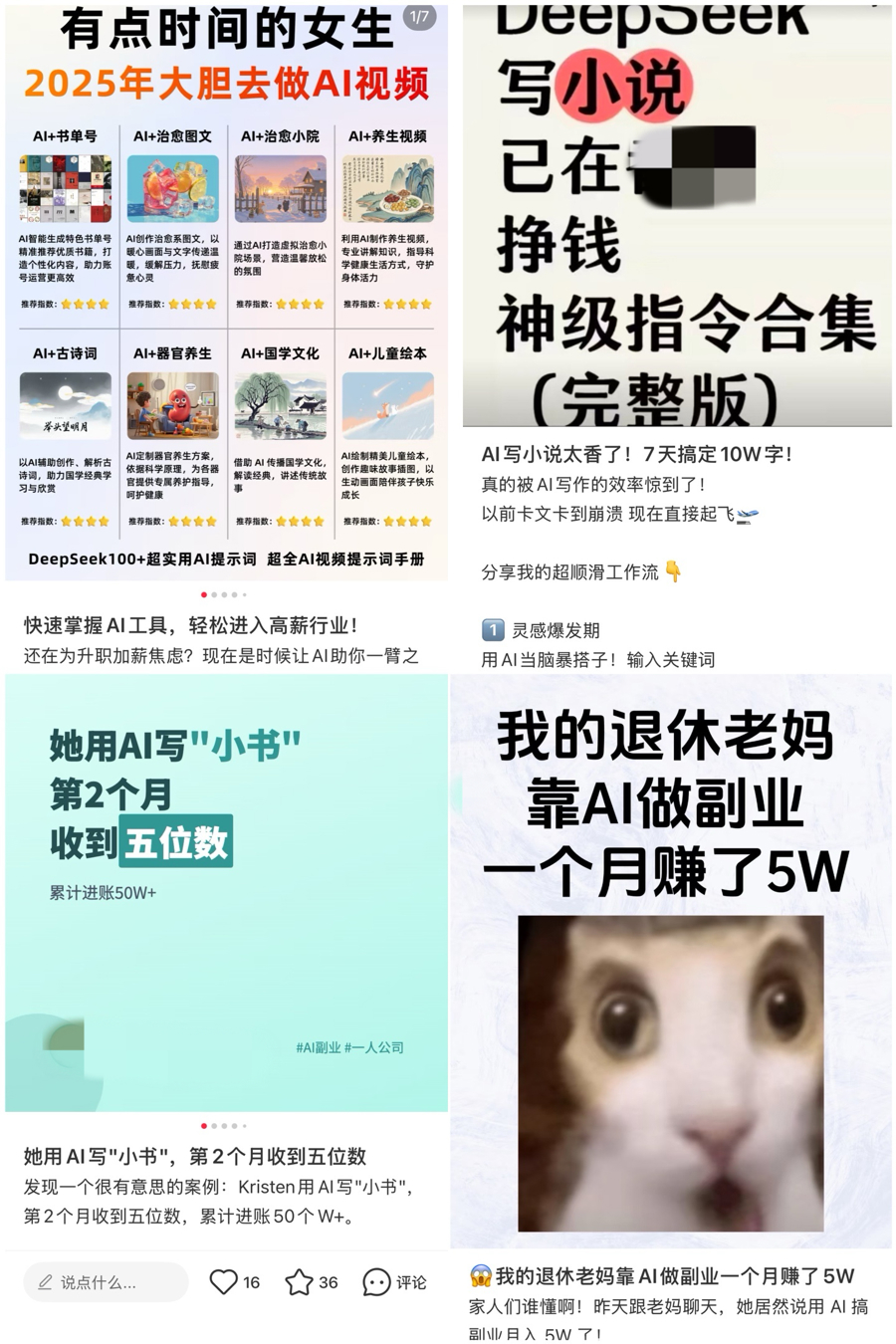 社交平台有大量鼓吹AI副业赚钱的帖子(网络截屏)