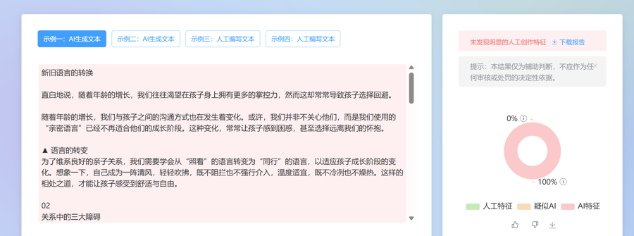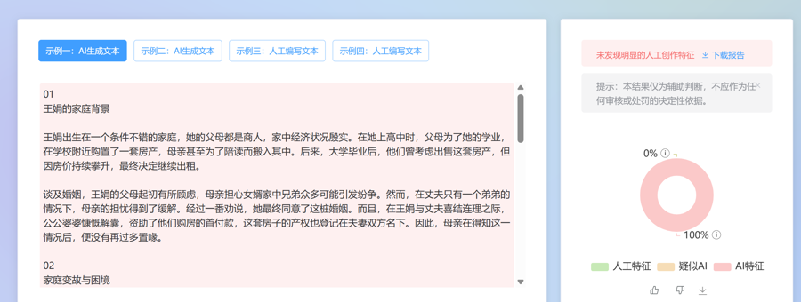 尤骑解释,此次鉴别成功的核心在于越来越多的大模型开发者开发出了鉴别工具,能精准捕捉AI生成内容的隐性特征。国内不少科技企业和科研机构也研发出了专门的AI生成内容检测工具。这些工具通过深度分析文本的语义模式、句式规整度、逻辑连贯性,以及图片的光影合理性、人物肢体细节,构建多维度鉴别模型。虽然识别准确率不能达到100%,但有很强的参考价值。