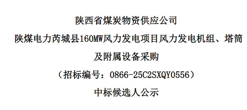 陕煤电力芮城县160MW风力发电项目风力发电机组、塔筒及附属设备采购中标候选人公示