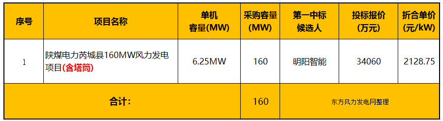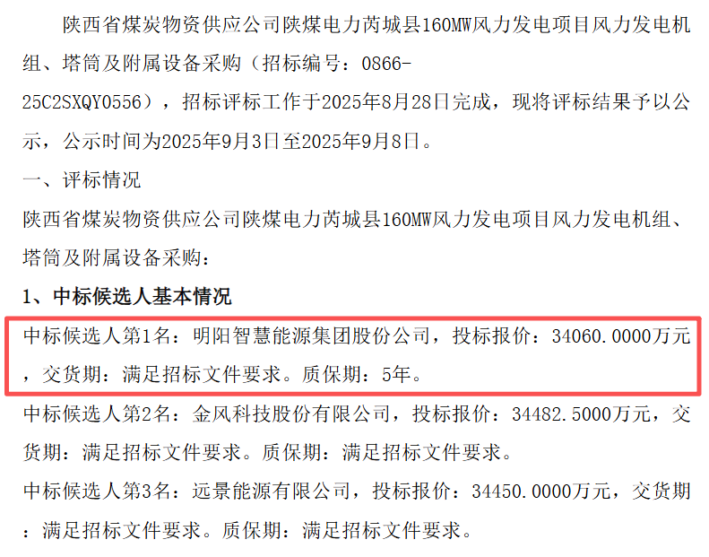 东方风力发电网讯:9月3日,秦源招标平台发布《陕煤电力芮城县160MW风力发电项目风力发电机组、塔筒及附属设备采购》中标候选人公示,规模容量:160MW,明阳智能为第一中标候选人,投标报价3.406亿元!